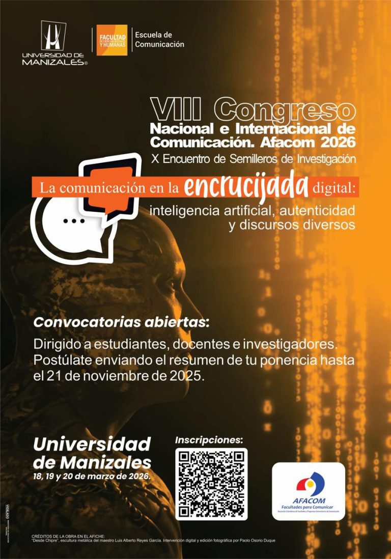 AFACOM tiene el gusto de invitarte al VIII Congreso Nacional e Internacional de Comunicación y al X Encuentro de Semilleros de Investigación, organizados por la Universidad de Manizales, en alianza con la Regional Eje Cafetero de AFACOM. El evento se realizará los días 18, 19 y 20 de marzo de 2026, en modalidad híbrida.