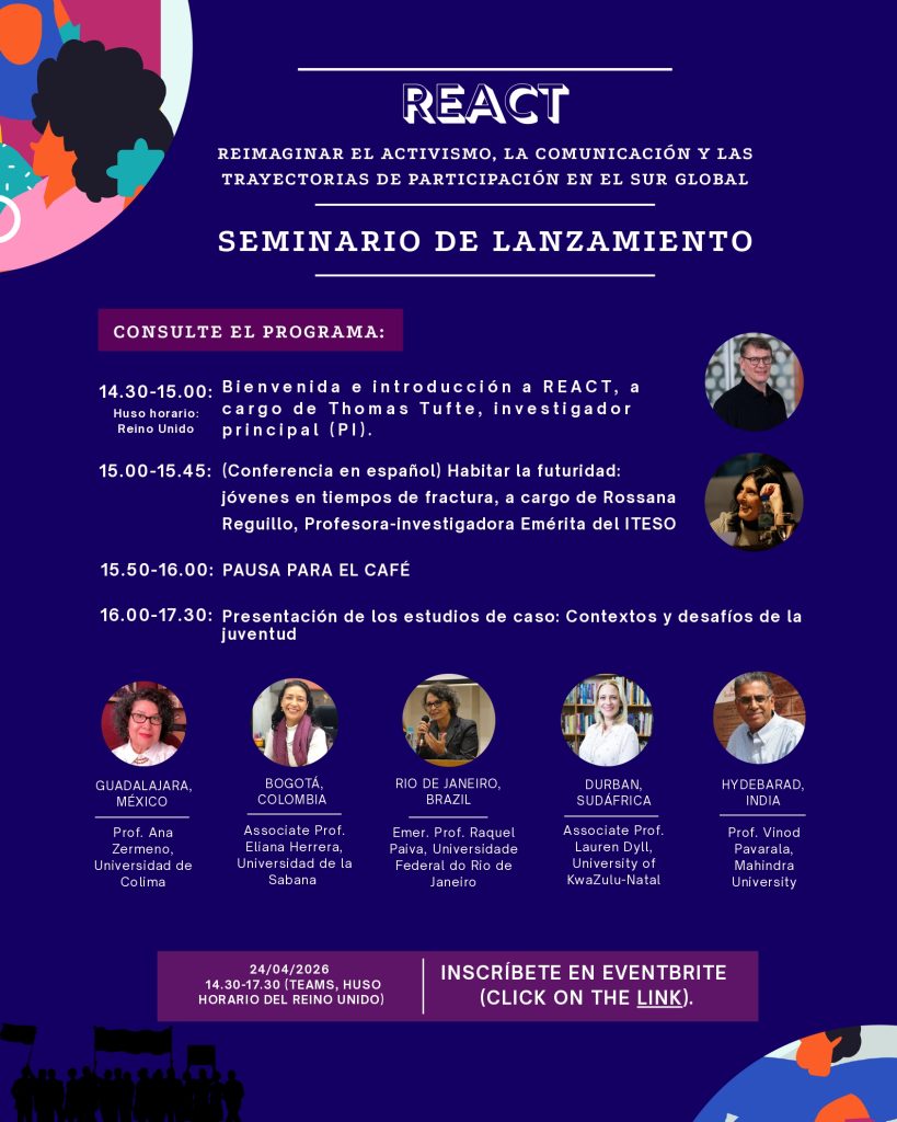 El próximo 24 de abril se llevará a cabo el seminario de lanzamiento del proyecto internacional REACT (Reimagining Activism, Communication, and Trajectories of Participation in the Global South), una iniciativa académica que propone repensar las formas contemporáneas de participación juvenil en contextos del Sur Global.