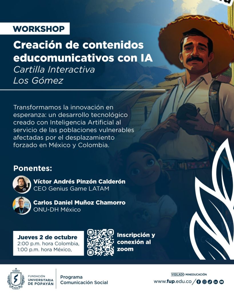 El Programa de Comunicación Social de la Fundación Universitaria de Popayán invita a participar en el Workshop virtual “Creación de contenidos educomunicativos con IA – Cartilla Interactiva Los Gómez, que se llevará a cabo el próximo jueves 2 de octubre de 2025, a las 2:00 p.m. (hora Colombia) / 1:00 p.m. (hora México), en modalidad virtual.